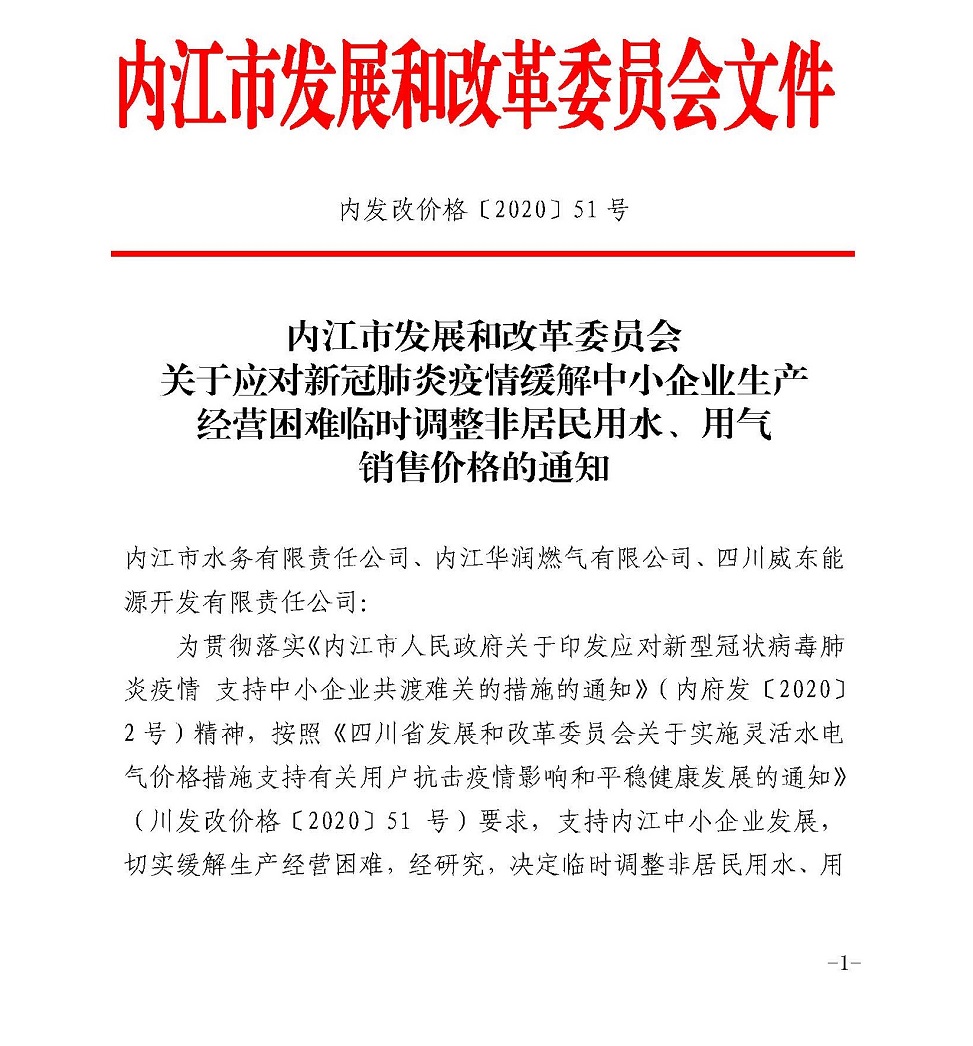 內江市發展和改革委員會關于應對新冠肺炎疫情緩解中小企業生產經營困難臨時調整非居民用水、用氣銷售價格的通知