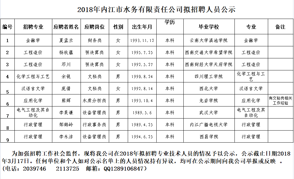 2018年內江市水務有限責任公司擬招聘人員公示