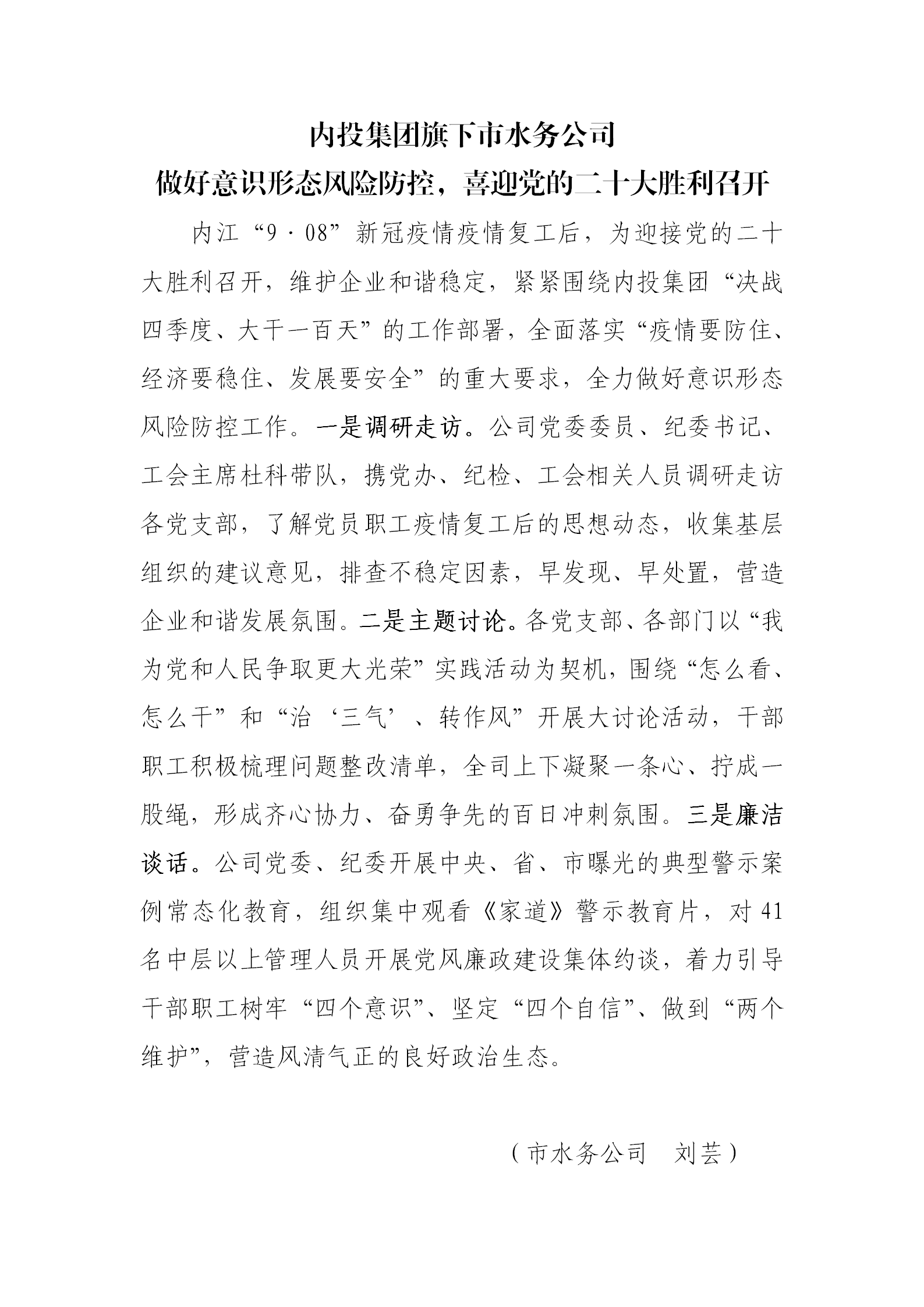 內投集團旗下市水務公司 做好意識形態風險防控,喜迎黨的二十大勝利召開