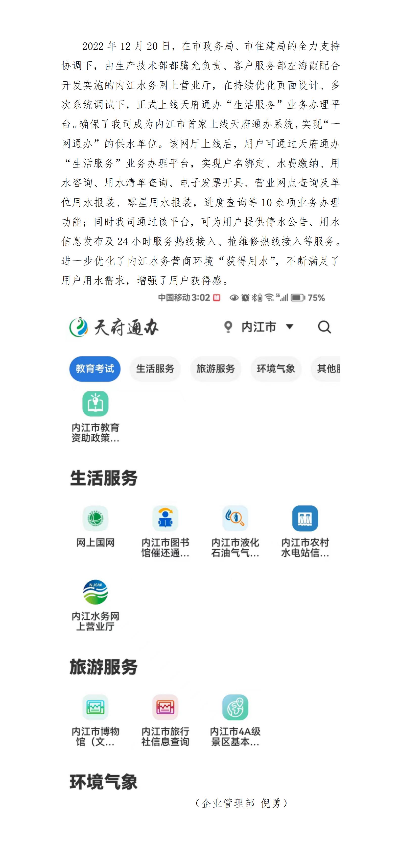 “讓數據多跑路,用戶少跑路” 內江水務網上營業廳正式上線天府通辦平臺