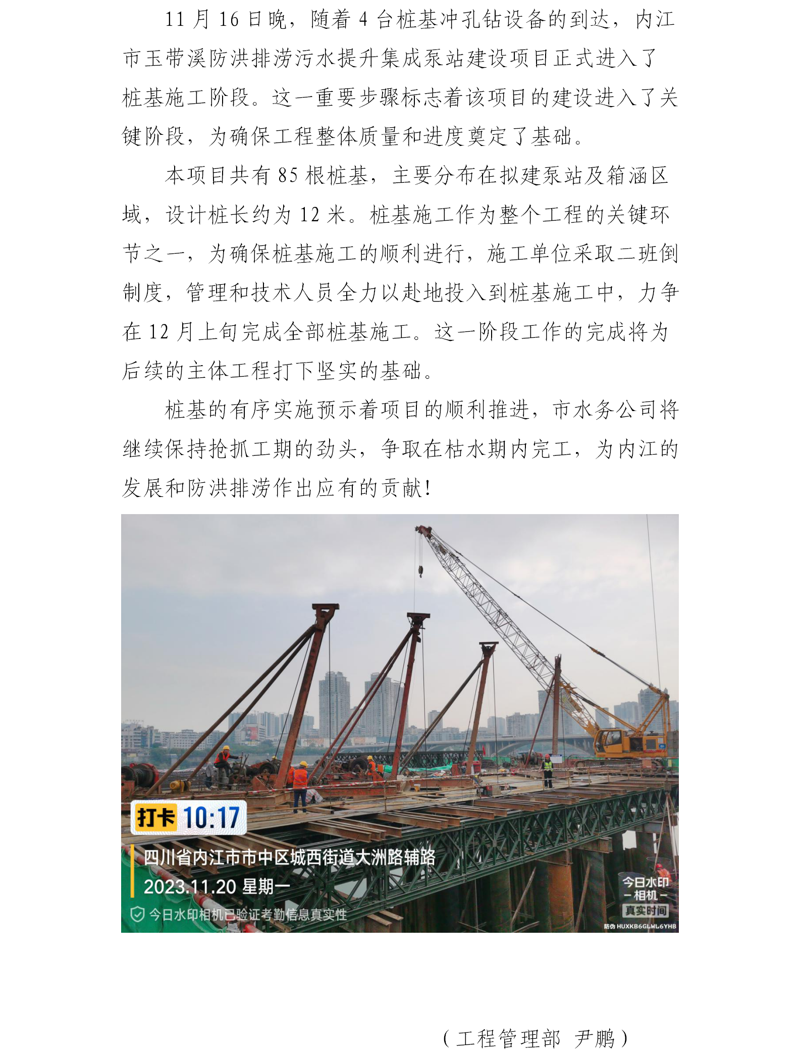 內(nèi)江市玉帶溪防洪排澇污水提升集成泵站建設(shè)項目進(jìn)入樁基施工階段