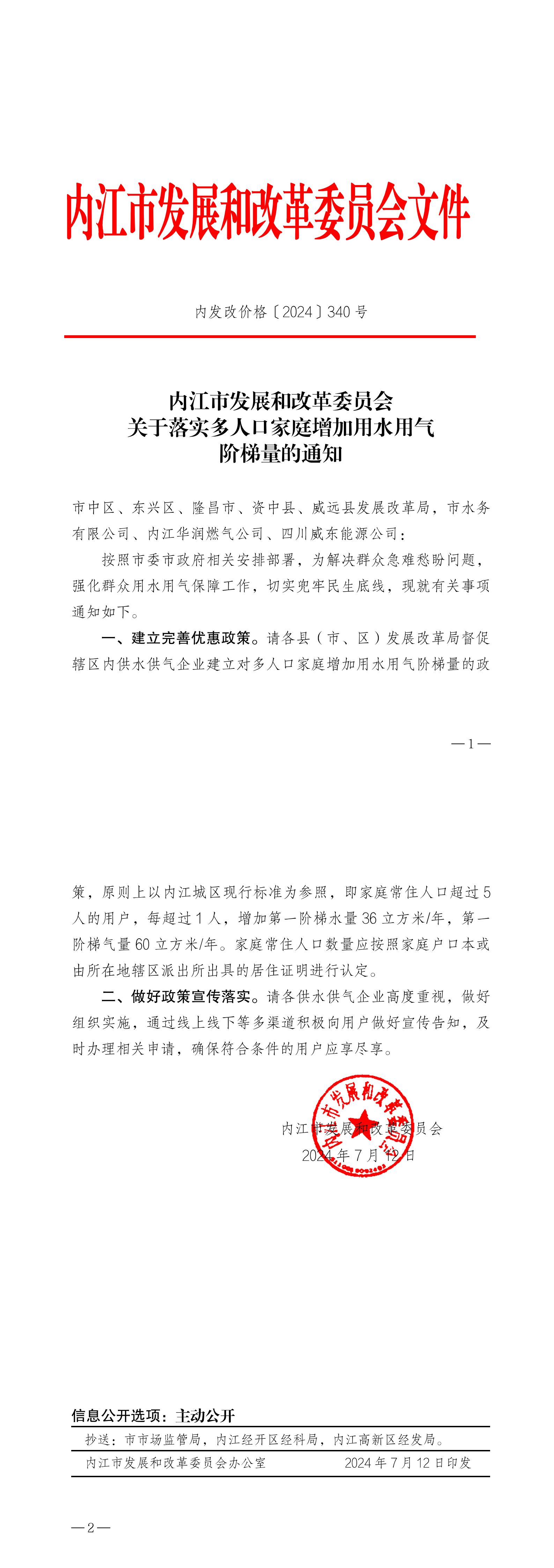 內(nèi)江市發(fā)展和改革委員會關(guān)于落實多人口家庭增加用水用氣階梯量的通知